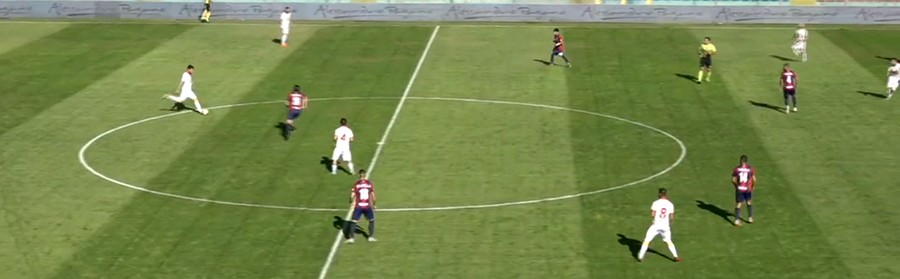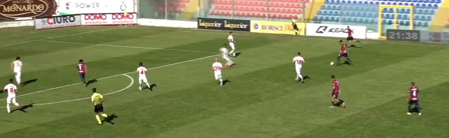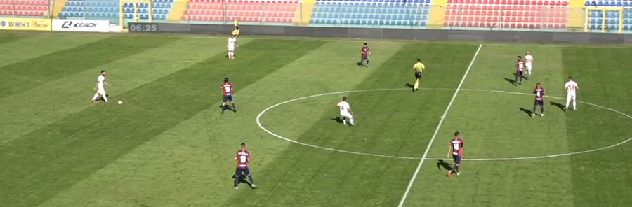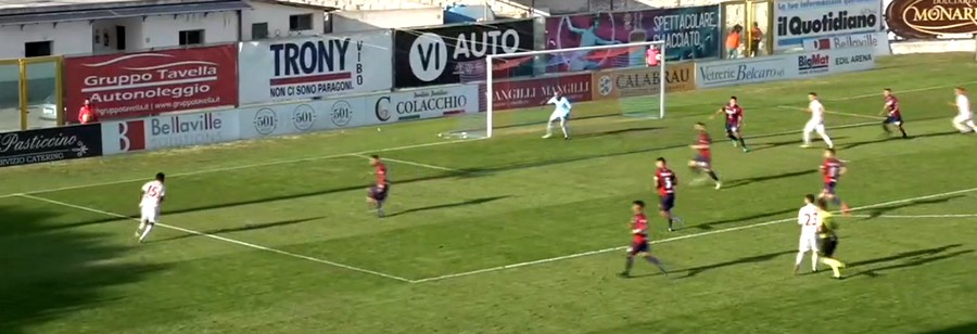 Il Catanzaro si è trovato dunque con la linea mediana completamente fuori gioco, Corapi e Verna cadevano nella trappola cercando la marcatura ad uomo su Pugliese, che restava più basso mentre la manovra si sviluppava in un altro fazzoletto di campo, oppure il raddoppio su Spina che prima di farsi chiudere nella gabbia riusciva a trovare in Ciotti il compagno che toglieva le castagne dal fuoco.