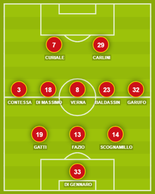 CATANZARO (3-5-2): 33 Di Gennaro; 14 Scognamillo, 13 Fazio, 19 Gatti; 32 Garufo, 23 Baldassin, 8 Verna, 18 Di Massimo, 3 Contessa; 29 Carlini, 7 Curiale. A disposizione: 22 Branduani, 1 Mittica, 16 Pierno, 20 Riccardi, 4 Corapi, 10 Parlati, 27 Casoli, 34 Porcino, 9 Jefferson, 15 Molinaro, 17 Evacuo, 25 Grillo. Allenatore: Calabro.