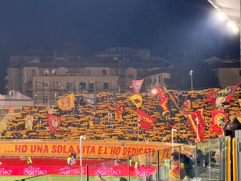A rendere ancora più affascinante l’atmosfera ci pensano gli Ultras. La coreografia allestita dalla curva è suggestiva, e nella notte catanzarese spiccano i colori giallorossi, con numerose sciarpe recanti la scritta “Ti Amo” che si fanno notare al momento dell’ingresso in campo delle squadre, dopo che il fumo provocato dai fuochi d’artificio si è dissipato. Lo striscione esposto sotto la curva racchiude tutta la passione che questo gruppo ha dimostrato nel corso degli anni: “Ho una sola vita e l’ho dedicata a te“.