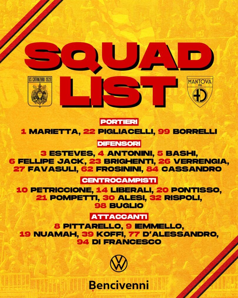 ATTACCANTI: 8 Pittarello, 9. Iemmello, 19. Nuamah, 39 Koffi, 77. D’Alessandro, 94. Di Francesco