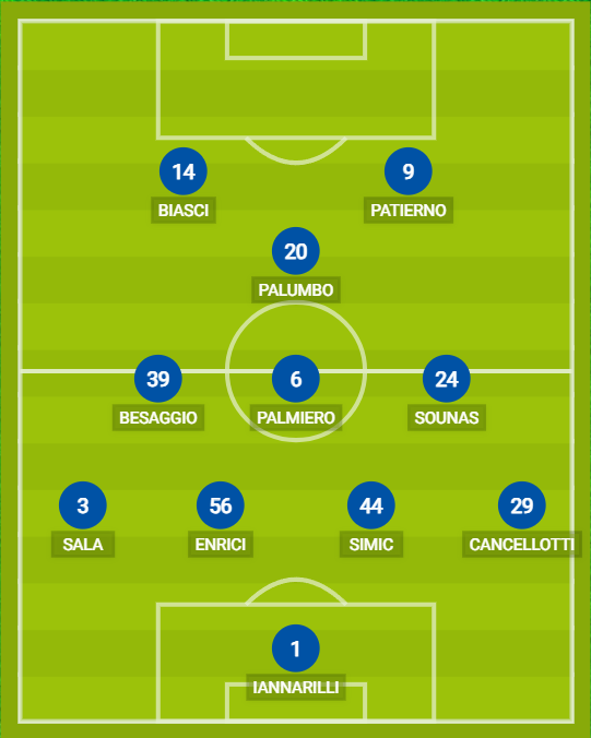 AVELLINO (4-3-1-2): 1 Iannarilli; 29 Cancellotti, 44 Simic, 56 Enrici, 3 Sala; 24 Sounas, 6 Palmiero, 39 Besaggio; 20 Palumbo; 9 Patierno, 14 Biasci. A disposizione: 45 Pane, 2 Missori, 63 Fontanarosa, 16 Kumi, 21 Armellino, 27 Le Borgne, 7 Tutino, 8 Pandolfi, 10 Russo, 11 D’Andrea, 94 Insigne, 99 Favilli. Allenatore: Ballardini.