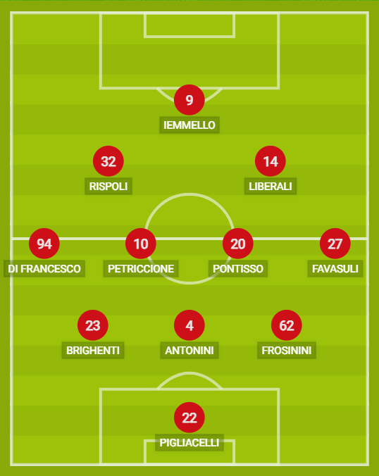 CATANZARO (3-4-2-1): 22 Pigliacelli; 62 Frosinini, 4 Antonini, 23 Brighenti; 27 Favasuli, 20 Pontisso, 10 Petriccione, 94 Di Francesco; 14 Liberali, 32 Rispoli; 9 Iemmello. A disposizione: 1 Marietta, 99 Borrelli, 2 Esteves, 5 Bashi, 6 Fellipe Jack, 26 Verrengia, 21 Pompetti, 28 Oudin, 98 Buglio, 39 Koffi, 81 Ardizzone. Allenatore: Aquilani.