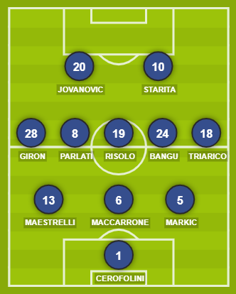 BISCEGLIE (3-5-2): 1 Cerofolini; 5 Markic, 6 Maccarrone, 13 Maestrelli; 18 Triarico, 24 Bangu, 19 Risolo, 8 Parlati, 28 Giron; 10 Starita, 20 Jovanovic. A disposizione: 22 Vassallo, 27 Ndjaye, 3 Mastrilli, 9 Djoulou, 15 Longo, 23 Giacomarro, 25 Casella, 14 Camporeale, 7 Dellino, 17 Cuomo, 21 Scalzone, 11 Cuppone. Allenatore: Vanoli.