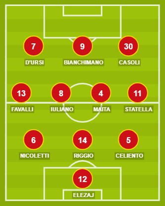 CATANZARO (3-4-3): 12 Elezaj; 5 Celiento, 14 Riggio, 6 Nicoletti; 11 Statella, 4 Maita, 8 Iuliano, 13 Favalli; 30 Casoli, 9 Bianchimano, 7 D’Ursi. A disposizione: 22 Mittica, 3 Pambianchi, 20 Lame, 16 Eklu, 18 Nikolopoulos, 19 De Risio, 10 Giannone, 2 Ciccone. Allenatore: Auteri.