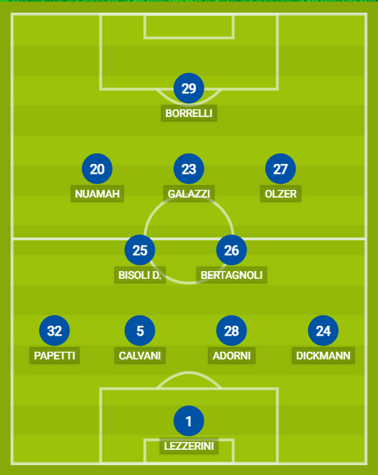 BRESCIA (4-2-3-1): 1 Lezzerini; 24 Dickmann, 28 Adorni, 5 Calvani, 32 Papetti; 26 Bertagnoli, 25 D.Bisoli; 27 Olzer, 23 Galazzi, 20 Nuamah; 29 Borrelli. A disposizione: 22 Andrenacci, 18 Jallow, 19 Corrado, 33 Muca, 4 Paghera, 8 Bjarnason, 14 Maucci, 39 Besaggio, 7 Juric, 9 Bianchi. Allenatore: P.Bisoli.