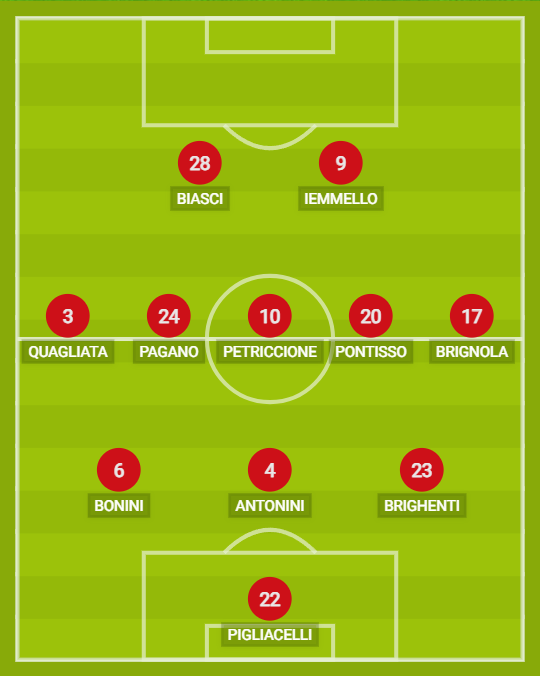 CATANZARO (3-5-2): 22 Pigliacelli; 23 Brighenti, 4 Antonini, 6 Bonini; 17 Brignola, 20 Pontisso, 10 Petriccione, 24 Pagano, 3 Quagliata; 9 Iemmello, 28 Biasci. A disposizione: 25 Gelmi, 99 Borrelli, 27 Ceresoli, 84 Cassandro, 8 Ilie, 61 Maiolo, 80 Coulibaly, 19 La Mantia, 45 Buso, 90 Pittarello. Allenatore: Caserta.