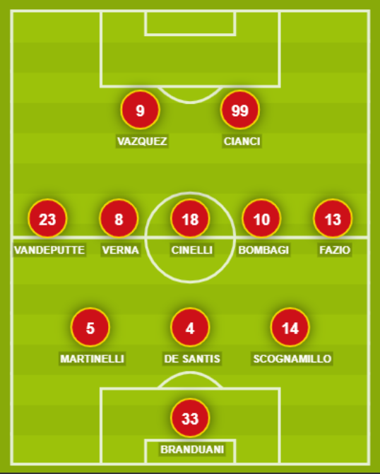 CATANZARO (3-5-2): 33 Branduani; 14 Scognamillo, 4 De Santis, 5 Martinelli; 13 Fazio, 10 Bombagi, 18 Cinelli, 8 Verna, 23 Vandeputte; 99 Cianci, 9 Vazquez. A disposizione: 1 Nocchi, 12 Romagnoli, 15 Monterisi, 44 Gatti, 2 Bayeye, 17 Porcino, 19 Ortisi, 21 Risolo, 37 Bearzotti, 7 Curiale, 29 Carlini. Allenatore: Milani (Vivarini squalificato).