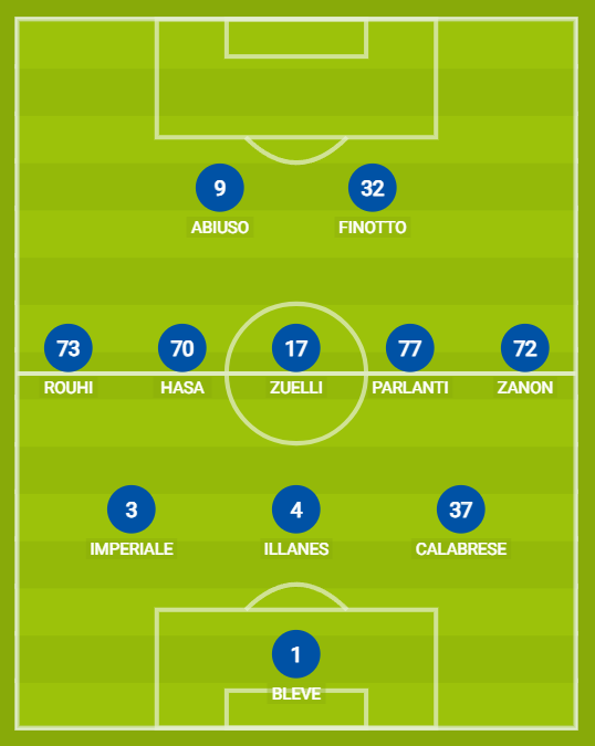 Indisponibili: Cisse, Di Francesco. Fuori distinta: Borrelli. Squalificati: nessuno. Diffidati: Pittarello, Cassandro, Frosinini, Nuamah, Iemmello.