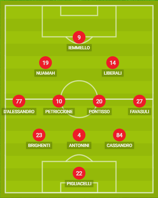 CATANZARO (3-4-2-1): 22 Pigliacelli; 84 Cassandro, 4 Antonini, 23 Brighenti; 27 Favasulii, 20 Pontisso, 10 Petriccione, 77 D’Alessandro; 14 Liberali, 19 Nuamah; 9 Iemmello. A disposizione: 1 Marietta, 2 Esteves, 5 Bashi, 6 Fellipe Jack, 26 Verrengia, 62 Frosinini, 21 Pompetti, 30 Alesi, 32 Rispoli, 98 Buglio, 8 Pittarello, 39 Koffi. Allenatore: Aquilani.