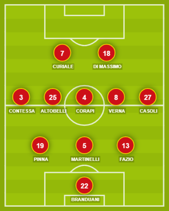 CATANZARO (3-5-2): 22 Branduani; 13 Fazio, 5 Martinelli, 19 Pinna; 27 Casoli, 8 Verna, 4 Corapi, 25 Altobelli, 3 Contessa; 18 Di Massimo, 7 Curiale. A disposizione: 33 Di Gennaro, 12 Iannì, 6 Salines, 14 Riggio, 20 Riccardi, 32 Garufo, 15 Evan’s, 21 Risolo, 23 Baldassin, 9 Di Piazza, 17 Evacuo, 29 Carlini. Allenatore: Calabro.