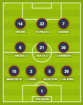 CATANIA (4-3-3): 1 Pulidori; 26 Calapai, 5 Silvestri, 3 Lovric, 15 Marchese; 30 Carriero, 21 Bucolo, 6 Angiulli; 7 Barisic. 32 Di Piazza, 14 Brodic. A disposizione: 22 Fabiani, 4 Aya, 2 Escu, 13 Bonaccorsi, 17 Baraye, 10 Lodi, 27 Biagianti, 19 Manneh, 33 Sarno, 24 Mujkic, 11 Curiale. Allenatore: Sottil.