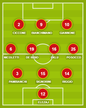 CATANZARO (3-4-3): 12 Elezaj; 14 Riggio, 15 Signorini, 3 Pambianchi; 25 Posocco, 16 Eklu, 19 De Risio, 6 Nicoletti; 10 Giannone, 9 Bianchimano, 2 Ciccone. A disposizione: 1 Furlan, 22 Mittica, 20 Lame, 13 Favalli, 18 Nikolopoulos, 4 Maita, 8 Iuliano, 11 Statella, 7 D’Ursi, 21 Fischnaller. Allenatore: Auteri.