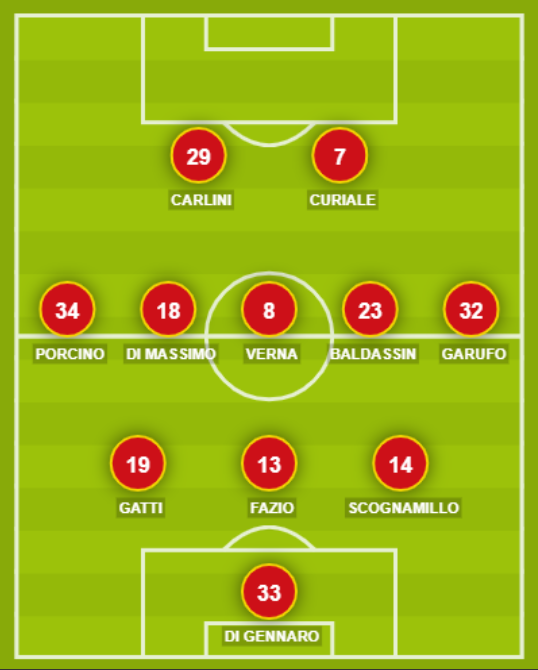 CATANZARO (3-5-2): 33 Di Gennaro; 14 Scognamillo, 13 Fazio, 19 Gatti; 32 Garufo, 23 Baldassin, 8 Verna, 18 Di Massimo, 34 Porcino; 7 Curiale, 29 Carlini. A disposizione: 22 Branduani, 1 Mittica, 3 Contessa, 16 Pierno, 20 Riccardi, 10 Parlati, 27 Casoli, 9 Jefferson, 15 Molinaro, 17 Evacuo, 25 Grillo. Allenatore: Calabro.