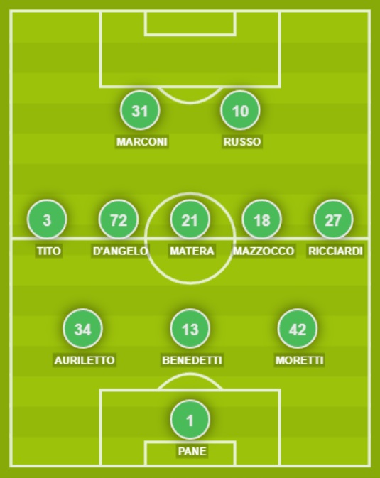 AVELLINO (3-5-2): 1 Pane; 42 Moretti, 13 Benedetti, 34 Auriletto; 27 Ricciardi, 21 Matera, 18 Mazzocco, 72 D’Angelo, 3 Tito; 10 Russo, 31 Marconi. A disposizione: 12 Marcone, 16 Pizzella, 6 Sottini, 39 Perrone, 8 Garetto, 20 Casarini, 28 Maisto, 9 Gambale, 14 Di Gaudio, 29 Trotta. Allenatore: Rastelli.