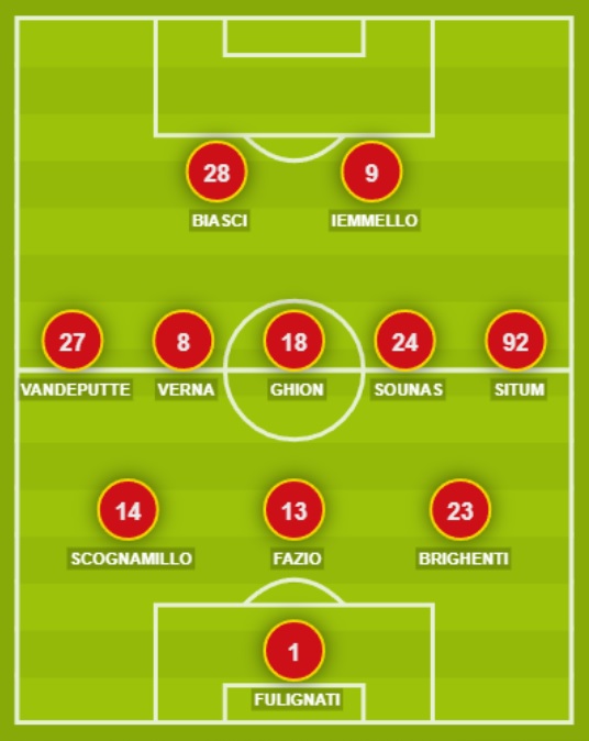 CATANZARO (3-5-2): 1 Fulignati; 23 Brighenti, 13 Fazio, 14 Scognamillo; 92 Situm, 24 Sounas, 18 Ghion, 8 Verna, 27 Vandeputte; 9 Iemmello, 28 Biasci. A disposizione: 16 Sala, 90 Grimaldi, 44 Gatti, 3 Tentardini, 6 Welbeck, 20 Pontisso, 77 Katseris, 88 Cinelli, 10 Bombagi, 17 Brignola, 21 Curcio, 99 Cianci. Allenatore: Vivarini.