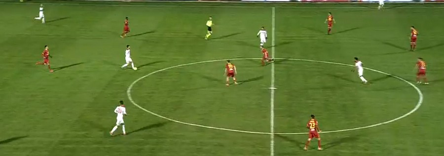 La capacità di affondo di Statella e la sintonia con i movimenti di Kanoutè mettono le ali al Catanzaro che risponde colpo su colpo. Anche a sinistra Carlini ingaggia un serrato duello con Ciofani liberando Contessa dalle briglie della marcatura. Proprio da un cross di quest’ultimo nascerà il gol del pari.