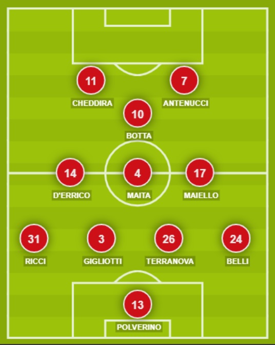 BARI (4-3-1-2): 13 Polverino; 24 Belli, 26 Terranova, 3 Gigliotti, 31 Ricci; 17 Maiello, 4 Maita, 14 D’Errico; 10 Botta; 7 Antenucci, 11 Cheddira. A disposizione: 22 Plitko, 6 Di Cesare, 23 Mazzotta, 8 Bianco, 21 Misuraca, 29 Scavone, 34 Daddario, 99 Mallamo, 9 Simeri, 19 Galano, 88 Paponi. Allenatore: Mignani.