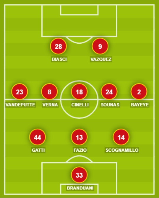CATANZARO (3-5-2): 33 Branduani; 14 Scognamillo, 13 Fazio, 44 Gatti; 2 Bayeye, 24 Sounas, 18 Cinelli, 8 Verna, 23 Vandeputte; 9 Vazquez, 28 Biasci. A disposizione: 1 Nocchi, 12 Romagnoli, 5 Martinelli, 3 Tentardini, 6 Welbeck, 15 Maldonado, 19 Bjarkason, 77 Rolando, 10 Bombagi, 29 Carlini, 90 Iemmello, 99 Cianci. Allenatore: Vivarini.
