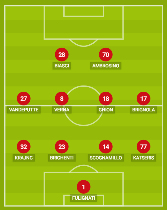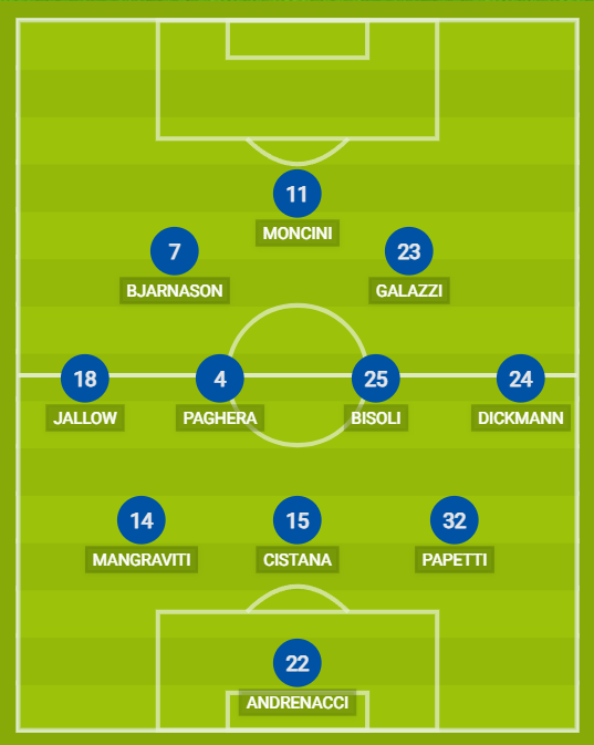 BRESCIA (3-4-2-1): 22 Andrenacci; 32 Papetti, 15 Cistana, 14 Mangraviti; 24 Dickmann, 25 Bisoli, 4 Paghera, 18 Jallow; 23 Galazzi, 7 Bjarnason; 11 Moncini. A disposizione: 12 Cortese, 3 Huard, 28 Adorni, 21 Fogliata, 26 Bertagnoli, 39 Besaggio, 9 Bianchi, 27 Olzer, 29 Borrelli, 31 Ferro. Allenatore: Maran.