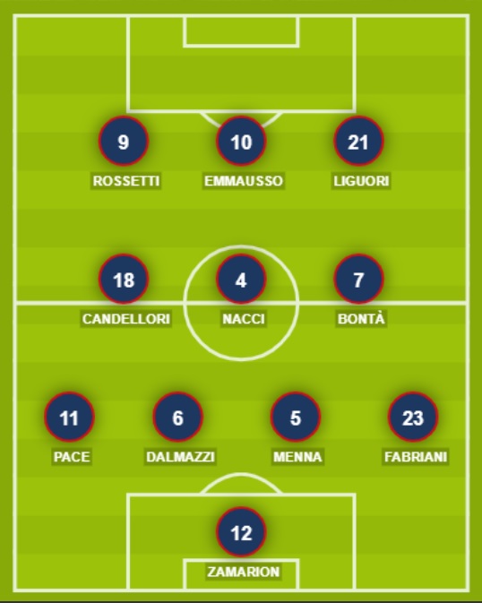 CAMPOBASSO (4-3-3): 12 Zamarion; 23 Fabriani, 5 Menna, 6 Dalmazzi, 11 Pace; 7 Bontà, 4 Nacci, 18 Candellori; 21 Liguori, 10 Emmausso, 9 Rossetti. A disposizione: 1 Raccichini, 22 Coco, 2 Sbardella, 3 Vanzan, 13 Martino, 8 Ladu, 19 Giunta, 14 Di Francesco, 24 Lombardi, 27 Merkaj, 98 Bolsius. Allenatore: Cudini.
