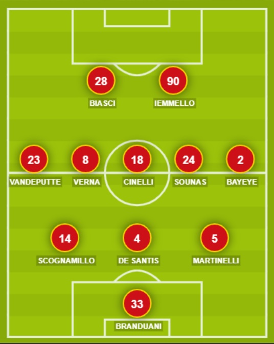 CATANZARO (3-5-2): 33 Branduani; 5 Martinelli, 4 De Santis, 14 Scognamillo; 2 Bayeye, 24 Sounas, 18 Cinelli, 8 Verna, 23 Vandeputte; 90 Iemmello, 28 Biasci. A disposizione: 12 Romagnoli, 22 Rizzuto, 20 Pipicella, 44 Gatti, 3 Tentardini, 6 Welbeck, 15 Maldonado, 19 Bjarkason, 77 Rolando, 9 Vazquez, 10 Bombagi, 99 Cianci. Allenatore: Vivarini.