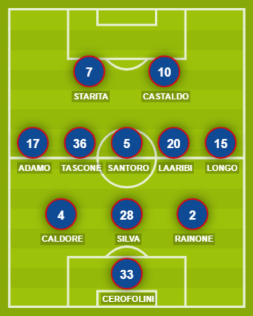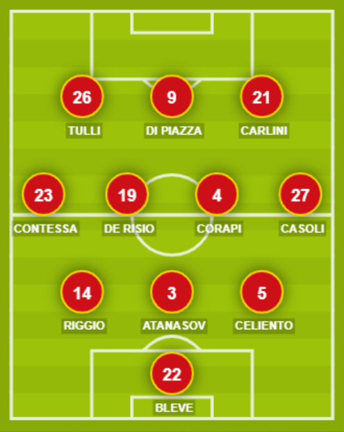 CATANZARO (3-4-3): 22 Bleve; 5 Celiento, 3 Atanasov, 14 Riggio; 27 Casoli, 4 Corapi, 19 De Risio, 23 Contessa; 21 Carlini, 9 Di Piazza, 26 Tulli. A disposizione: 12 Mittica, 6 Nicoletti, 31 Quaranta, 8 Urso, 11 Statella, 28 Iuliano, 32 Bayeye, 10 Giannone, 17 Novello, 18 Bianchimano, 20 Di Livio. Allenatore: Auteri.