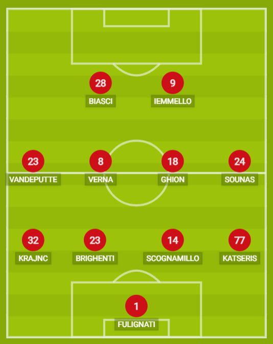 CATANZARO (4-4-2): 1 Fulignati; 77 Katseris, 14 Scognamillo, 23 Brighenti, 32 Krajnc; 24 Sounas, 18 Ghion, 8 Verna, 27 Vandeputte; 9 Iemmello, 28 Biasci. A disposizione: 16 Sala, 22 Borrelli, 5 Krastev, 72 Veroli, 20 Pontisso, 30 Belpanno, 33 Oliveri, 7 D’Andrea, 17 Brignola, 19 Stoppa, 70 Ambrosino, 99 Donnarumma. Allenatore: Milani (Vivarini squalificato).