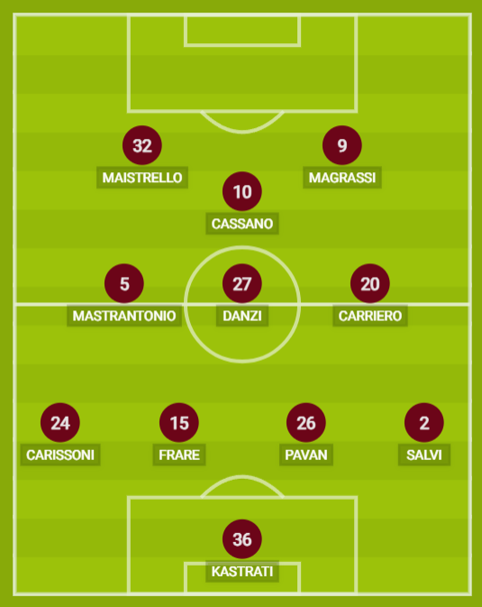 CITTADELLA (4-3-1-2): 36 Kastrati; 2 Salvi, 26 Pavan, 15 Frare, 24 Carissoni; 20 Carriero, 27 Danzi, 5 Mastrantonio; 10 Cassano; 9 Magrassi, 32 Maistrello. A disposzione: 77 Maniero, 4 Angeli, 28 Rizza, 98 Giraudo, 16 Vita, 17 Korving, 18 Tessiore, 23 Branca, 11 Pittarello, 92 Baldini. Allenatore: Gorini.