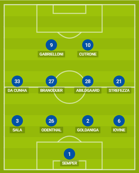 COMO (4-4-2): 1 Semper; 6 Iovine, 2 Goldaniga, 26 Odenthal, 3 Sala; 21 Strefezza, 28 Abildgaard, 27 Braunoder, 33 Da Cunha; 10 Cutrone, 9 Gabrielloni. A disposizione: 22 Vigorito, 5 Curto, 44 Ioannou, 84 Cassandro, 93 Barba, 8 Baselli, 32 Rispoli, 70 Ballet, 7 Chajia, 23 Gioacchini, 77 Nsame, 99 Fumagalli. Allenatori: Roberts-Fabregas.
