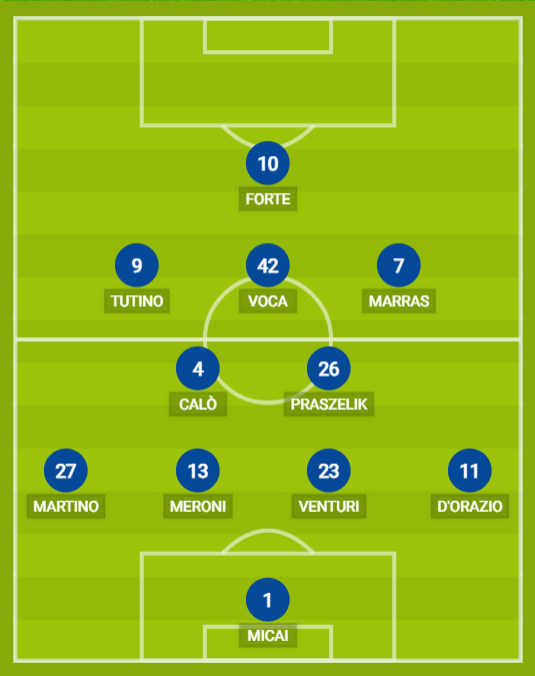 COSENZA (4-2-3-1): 1 Micai; 27 Martino, 13 Meroni, 23 Venturi, 11 D’Orazio; 14 Calò, 28 Praszelik; 7 Marras, 42 Voca, 9 Tutino; 10 Forte. A disposizione: 12 Lai, 77 Marson, 2 Sgarbi, 3 Rispoli, 6 Fontanarosa, 17 Cimino, 33 La Vardera, 34 Florenzi, 98 Zuccon, 19 Crespi, 20 Arioli, 21 Zilli, 30 Mazzocchi, 31 Canotto. Allenatore: Caserta.