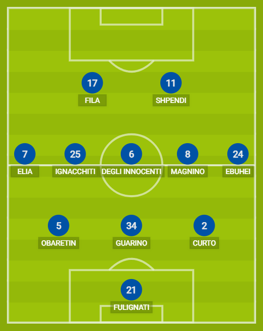 EMPOLI (3-5-2): 21 Fulignati; 2 Curto, 34 Guarino, 5 Obaretin; 24 Ebuehi, 8 Magnino, 6 Degli Innocenti, 25 Ignacchiti, 7 Elia; 11 Shpendi, 17 Fila. A disposizione: 1 Perisan, 13 Gasparini, 28 Indragoli, 4 Romagnoli, 26 Candela, 32 Haas, 16 Ceesay, 14 Yepes, 70 Saporiti, 99 Bianchi. Allenatore: Dionisi.