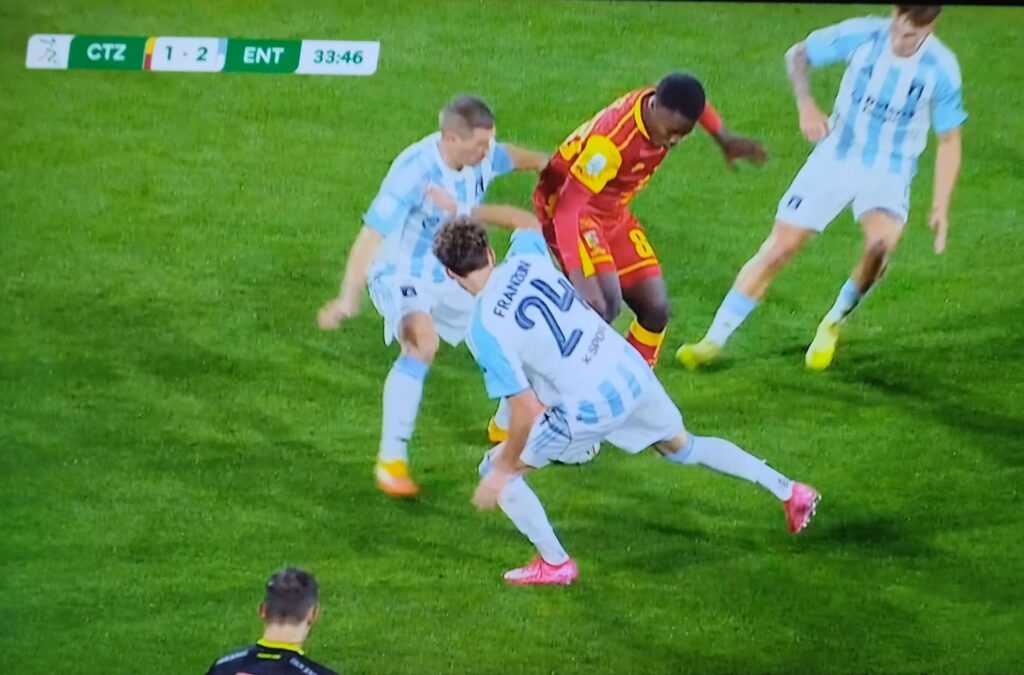 Al 33° anche la seconda rete dell’Entella nasce da un possibile fallo su un giocatore delle Aquile: Cisse difende un pallone nei pressi del cerchio di centrocampo, con tre avversari vicini, con Marconi che da dietro tocca la sfera ma pare prendere anche il giallorosso, che cade a terra.