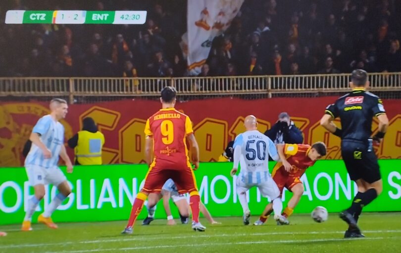 Al 42° azione insistita del Catanzaro nell’area avversaria: la palla finisce sui piedi di Benali, che se l’allunga, con Favasuli che lo anticipa e prende un pestone dall’anglo-libico sul piede d’appoggio, come potete vedere dalla nostra copertina. Tremolada è proprio lì davanti e fischia subito il rigore.