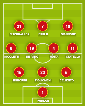 CATANZARO (3-4-3): 1 Furlan; 5 Celiento, 23 Figliomeni, 15 Signorini; 11 Statella, 4 Maita, 19 De Risio, 6 Nicoletti; 10 Giannone, 7 D’Ursi, 21 Fischnaller. A disposizione: 12 Elezaj, 22 Mittica, 3 Pambianchi, 14 Riggio, 20 Lame, 8 Iuliano, 16 Eklu, 25 Posocco, 30 Casoli, 2 Ciccone, 9 Bianchimano, 17 Kanoute. Allenatore: Auteri.
