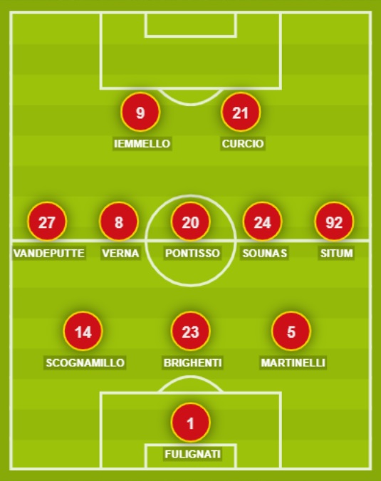 CATANZARO (3-5-2): 1 Fulignati; 5 Martinelli, 23 Brighenti, 14 Scognamillo; 92 Situm, 24 Sounas, 20 Pontisso, 8 Verna, 27 Vandeputte; 21 Curcio, 9 Iemmello. A disposizione: 16 Sala, 40 Gualtieri, 13 Fazio, 44 Gatti, 3 Tentardini, 6 Welbeck, 7 Rolando, 77 Katseris, 88 Cinelli, 17 Brignola, 28 Biasci, 99 Cianci. Allenatore: Vivarini.