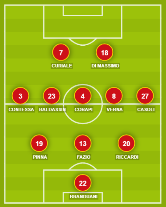 CATANZARO (3-5-2): 22 Branduani; 20 Riccardi, 13 Fazio, 19 Pinna; 27 Casoli, 8 Verna, 4 Corapi, 23 Baldassin, 3 Contessa; 18 Di Massimo, 7 Curiale. A disposizione: 33 Di Gennaro, 12 Iannì, 6 Salines, 14 Riggio, 26 Pipicella, 32 Garufo, 15 Evan’s, 21 Risolo, 25 Altobelli, 9 Di Piazza, 17 Evacuo, 29 Carlini. Allenatore: Calabro.