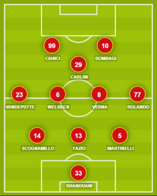 CATANZARO (3-4-1-2): 33 Branduani; 5 Martinelli, 13 Fazio, 14 Scognamillo; 77 Rolando, 8 Verna, 6 Welbeck, 23 Vandeputte; 29 Carlini; 10 Bombagi, 99 Cianci. A disposizione: 1 Nocchi, 12 Romagnoli, 4 De Santis, 15 Monterisi, 44 Gatti, 3 Tentardini, 17 Porcino, 18 Cinelli, 21 Risolo, 37 Bearzotti, 7 Curiale, 9 Vazquez. Allenatore: Calabro.
