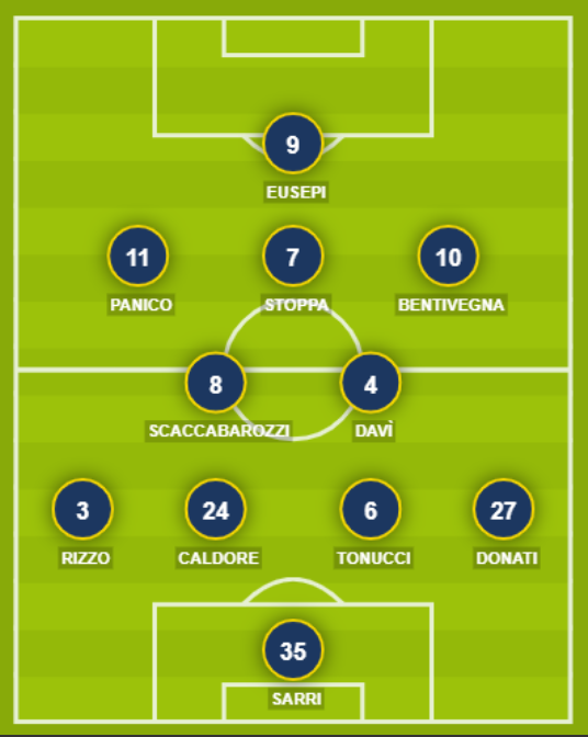 JUVE STABIA (4-2-3-1): 35 Sarri; 27 Donati, 6 Tonucci, 24 Caldore, 3 Rizzo; 4 Davì, 8 Scaccabarozzi; 10 Bentivegna, 7 Stoppa, 11 Panico; 9 Eusepi. A disposizione: 1 Russo, 22 Pozzer, 2 Todisco, 21 Cinaglia, 14 Berardocco, 16 Squizzato, 17 Guarracino, 25 Altobelli, 18 Della Pietra, 19 Lipari, 32 Evacuo. Allenatore: Sottili.