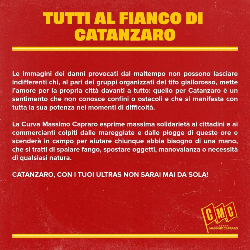 Il maltempo che ha colpito Catanzaro ha causato disagi e danni a cittadini e commercianti. In queste ore difficili, la Curva Massimo Capraro ha espresso la propria solidarietà e la disponibilità a scendere in campo per aiutare chi ne ha bisogno.