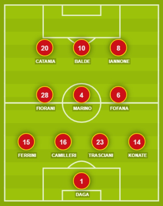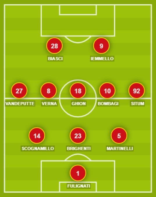 CATANZARO (3-5-2): 1 Fulignati; 5 Martinelli, 23 Brighenti, 14 Scognamillo; 92 Situm, 10 Bombagi, 18 Ghion, 8 Verna, 27 Vandeputte; 9 Iemmello, 28 Biasci. A disposizione: 16 Sala, 22 Chilà, 13 Fazio, 44 Gatti, 45 Mulè, 3 Tentardini, 6 Welbeck, 20 Pontisso, 88 Cinelli, 21 Curcio, 99 Cianci. Allenatore: Vivarini.
