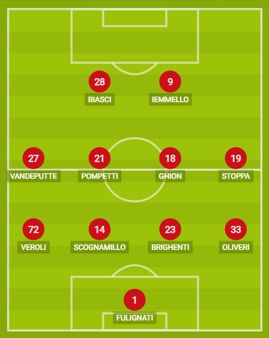 CATANZARO (4-4-2): 1 Fulignati; 33 Oliveri, 14 Scognamillo, 23 Brighenti, 72 Veroli; 19 Stoppa, 18 Ghion, 21 Pompetti, 27 Vandeputte; 9 Iemmello, 28 Biasci. A disposizione: 16 Sala, 22 Borrelli, 5 Krastev, 32 Krajnc, 44 Miranda, 20 Pontisso, 24 Sounas, 77 Katseris, 92 Situm, 7 D’Andrea, 17 Brignola, 70 Ambrosino, 99 Donnarumma. Allenatore: Vivarini.