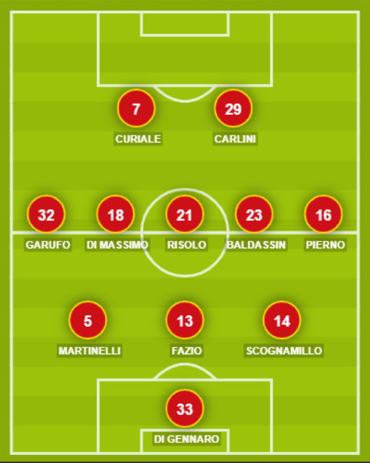 CATANZARO (3-5-2): 33 Di Gennaro; 14 Scognamillo, 13 Fazio, 5 Martinelli; 16 Pierno, 23 Baldassin, 21 Risolo, 18 Di Massimo, 32 Garufo; 29 Carlini, 7 Curiale. A disposizione: 22 Branduani, 1 Mittica, 19 Gatti, 20 Riccardi, 3 Contessa, 8 Verna, 10 Parlati, 34 Porcino, 9 Jefferson, 15 Molinaro, 17 Evacuo, 25 Grillo. Allenatore: Calabro.