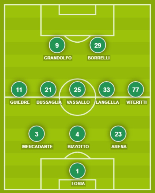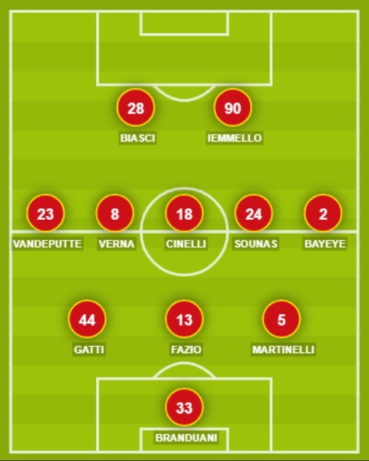 CATANZARO (3-5-2): 33 Branduani; 5 Martinelli, 13 Fazio, 44 Gatti; 2 Bayeye, 24 Sounas, 18 Cinelli, 8 Verna, 23 Vandeputte; 90 Iemmello, 28 Biasci. A disposizione: 1 Nocchi, 12 Romagnoli, 4 De Santis, 3 Tentardini, 6 Welbeck, 15 Maldonado, 19 Bjarkason, 77 Rolando, 9 Vazquez, 10 Bombagi, 29 Carlini, 99 Cianci. Allenatore: Vivarini.
