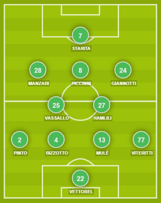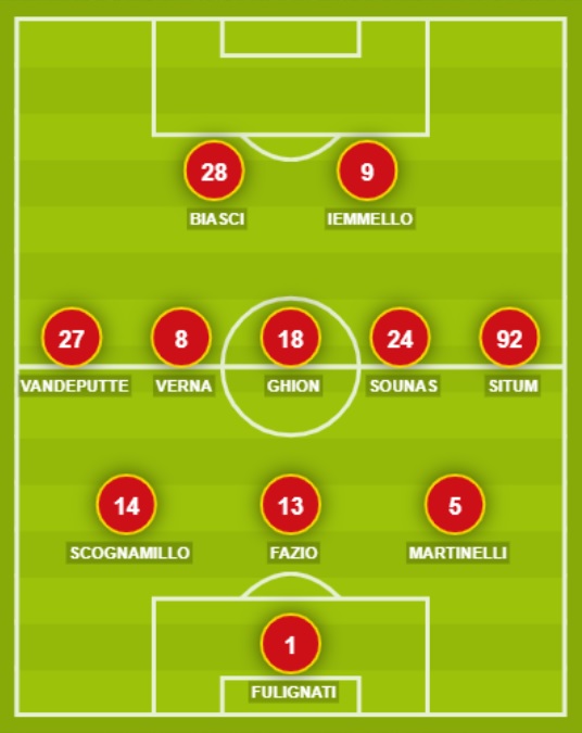 CATANZARO (3-5-2): 1 Fulignati; 5 Martinelli, 13 Fazio, 14 Scognamillo; 92 Situm, 24 Sounas, 18 Ghion, 8 Verna, 27 Vandeputte; 9 Iemmello, 28 Biasci. A disposizione: 16 Sala, 90 Grimaldi, 44 Gatti, 3 Tentardini, 6 Welbeck, 7 Rolando, 20 Pontisso, 77 Katseris, 88 Cinelli, 10 Bombagi, 17 Brignola, 21 Curcio, 99 Cianci. Allenatore: Milani (Vivarini squalificato).