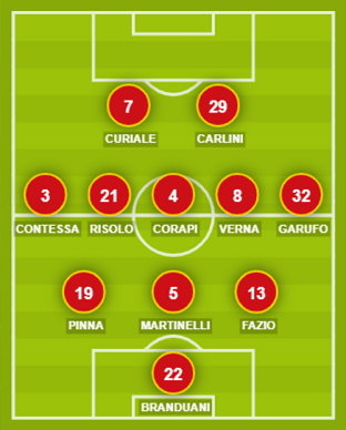 CATANZARO (3-5-2): 22 Branduani; 13 Fazio, 5 Martinelli, 19 Pinna; 32 Garufo, 8 Verna, 4 Corapi, 21 Risolo, 3 Contessa; 29 Carlini, 7 Curiale. A disposizione: 1 Mittica, 12 Iannì, 6 Salines, 14 Riggio, 20 Riccardi, 26 Pipicella, 23 Baldassin, 25 Altobelli, 34 Evan’s, 17 Evacuo, 18 Di Massimo, 24 Cristiano. Allenatore: Calabro.