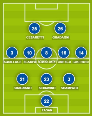PAGANESE (3-5-2): 22 Fasan; 3 Sbambato, 23 Schiavino, 21 Sirignano; 14 Carotenuto, 16 Onescu, 8 Bonavolontà, 10 Scarpa, 3 Squillace; 26 Guadagni, 25 Cesaretti. A disposizione: 1 Campani, 12 Bovenzi, 2 Esposito, 5 Mattia, 13 Perazzolo, 20 Cigagna, 19 Benedetti, 9 Isufaj, 11 Diop, 18 Mendicino. Allenatore: Erra.
