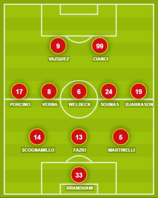 CATANZARO (3-5-2): 33 Branduani; 5 Martinelli, 13 Fazio, 14 Scognamillo; 19 Bjarkason, 24 Sounas, 6 Welbeck, 8 Verna, 17 Porcino; 99 Cianci, 9 Vazquez. A disposizione: 1 Nocchi, 12 Romagnoli, 4 De Santis, 44 Gatti, 2 Bayeye, 18 Cinelli, 7 Curiale, 10 Bombagi, 28 Biasci, 29 Carlini. Allenatore: Vivarini.