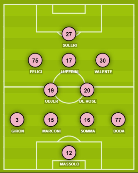 PALERMO (4-2-3-1): 12 Massolo; 77 Doda, 16 Somma, 15 Marconi, 3 Giron; 20 De Rose, 19 Odjer; 30 Valente, 17 Luperini, 75 Felici; 27 Soleri. A disposizione: 22 Misseri, 4 Accardi, 6 Crivello, 33 Perrotta, 79 Lancini, 11 Dall’Oglio, 21 Damiani, 7 Floriano, 9 Brunori, 10 Silipo, 23 Fella. Allenatore: Baldini.