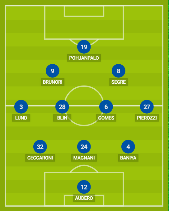 PALERMO (3-4-2-1): 12 Audero; 4 Baniya, 24 Magnani, 32 Ceccaroni; 27 Pierozzi, 6 Gomes, 28 Blin, 3 Lund; 8 Segre, 9 Brunori; 19 Pohjanpalo. A disposizione: 1 Desplanches, 46 Sirigu, 25 Buttaro, 43 Nikolaou, 23 Diakité, 10 Ranocchia, 14 Vasic, 26 Verre, 7 Di Mariano, 11 Insigne, 20 Henry, 21 Le Douaron. Allenatore: Dionisi.