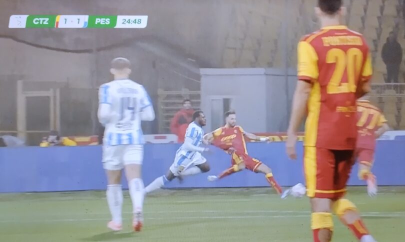 Già in quel momento sembra palese il fuorigioco, ma l’azione prosegue e il ragazzo di Calabria entra in area e infila Desplanches in uscita. Si alza subito la bandierina dell’assistente sotto i Distinti e, per chi guarda dagli schermi, il replay evidenzia la posizione irregolare.